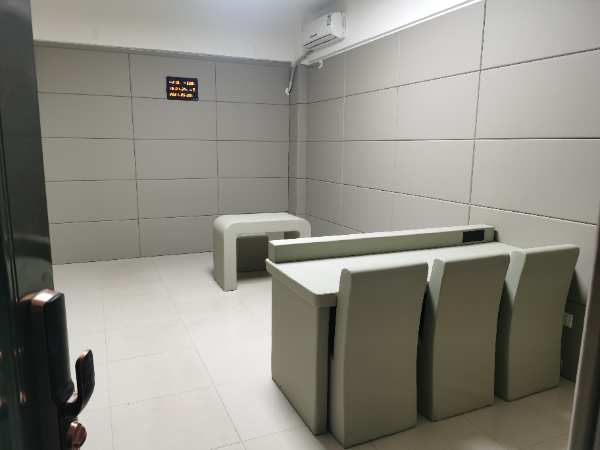 審訊室面積為15-30平方,一般設(shè)置2臺(tái)全景攝像頭及1臺(tái)特寫(xiě)攝像頭,1臺(tái)在線視頻系統(tǒng),通過(guò)聯(lián)網(wǎng)服務(wù)器進(jìn)行遠(yuǎn)程指揮及同步錄音攝像,房間內(nèi)配備示證視頻系統(tǒng)。配備辦公和談話桌椅,辦公和審訊桌椅均采用軟質(zhì)包覆,無(wú)安全隱患,配備多媒體排口系統(tǒng),方便辦公人員的電器設(shè)備,及視頻系統(tǒng)?!檫M(jìn)一步防止被審訊人的人身安全,以頭撞墻產(chǎn)生以外,墻面應(yīng)用厚度大于2cm阻燃防撞軟體材料進(jìn)行覆蓋,絕對(duì)不允許意外事件的發(fā)生。室內(nèi)電器設(shè)備安裝不規(guī)范有可能導(dǎo)致意外事件的發(fā)生。因此室內(nèi)所有的電器設(shè)備的電源插座,開(kāi)關(guān)都建議采用集中控制的方式,由電腦控制開(kāi)關(guān),手動(dòng)控制器和集線箱應(yīng)安裝在過(guò)道或監(jiān)控房?jī)?nèi)。為防止意外事件的發(fā)生,不建議使用公共衛(wèi)生間給被談話人使用。所以每間房間必須有獨(dú)立的衛(wèi)生間,所有馬桶及洗手盆必須軟包處理,并安裝隱蔽攝像頭。